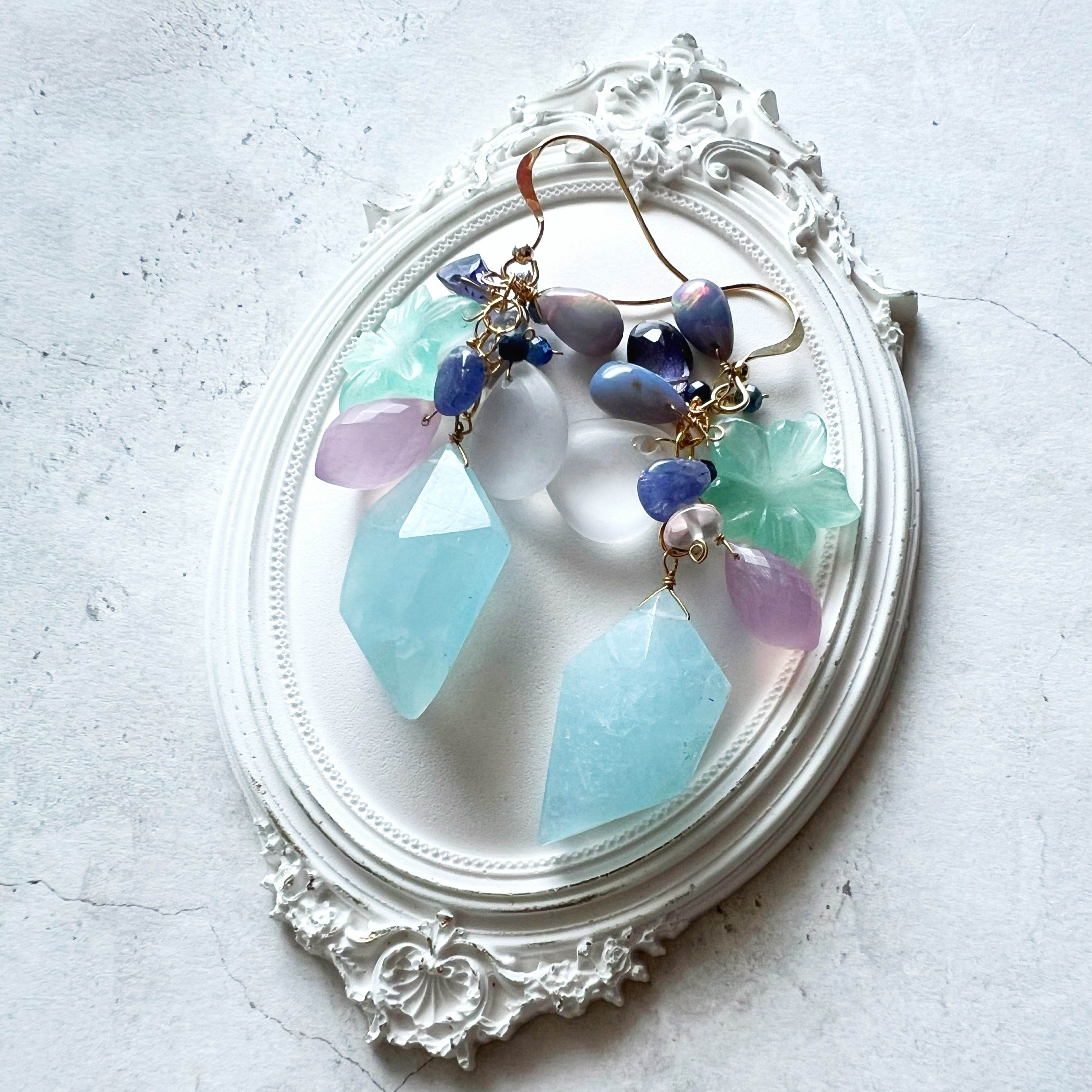 *石 アクアマリン、ミントグリーンカルセドニー、ラベンダーカルセドニー、フロスト加工クリスタル、くすみピンクカラーオパール、ブルーサファイア、アイオライト