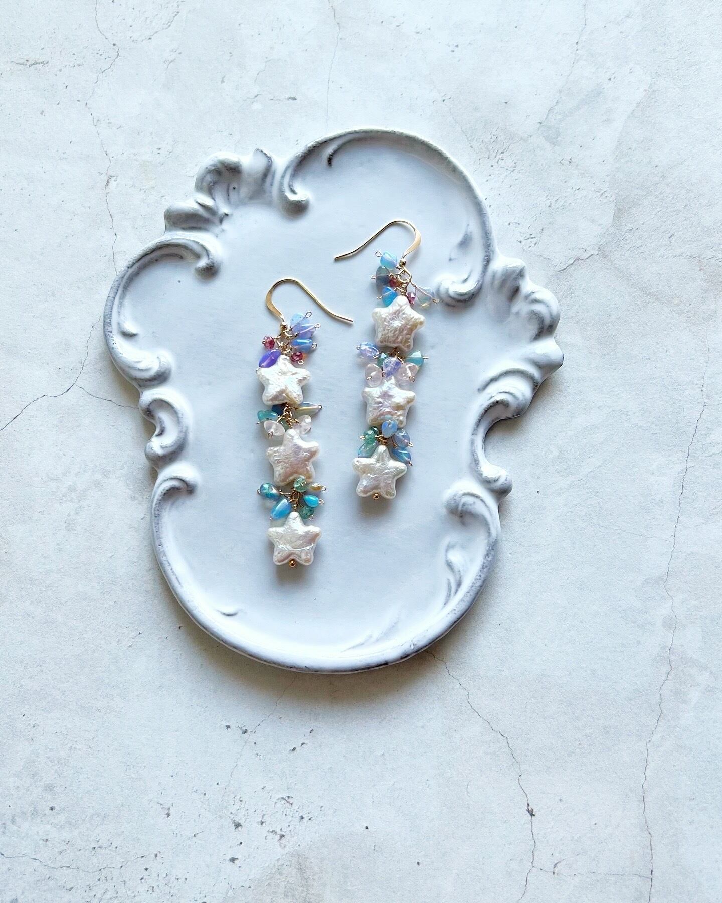 星の形の淡水パールは、まるで星空を耳もとに運んでくれるようなメルヘンな印象を与え、ラベンダーカラーのオパールは穏やかな色合いで一層の魅力を引き立てます。