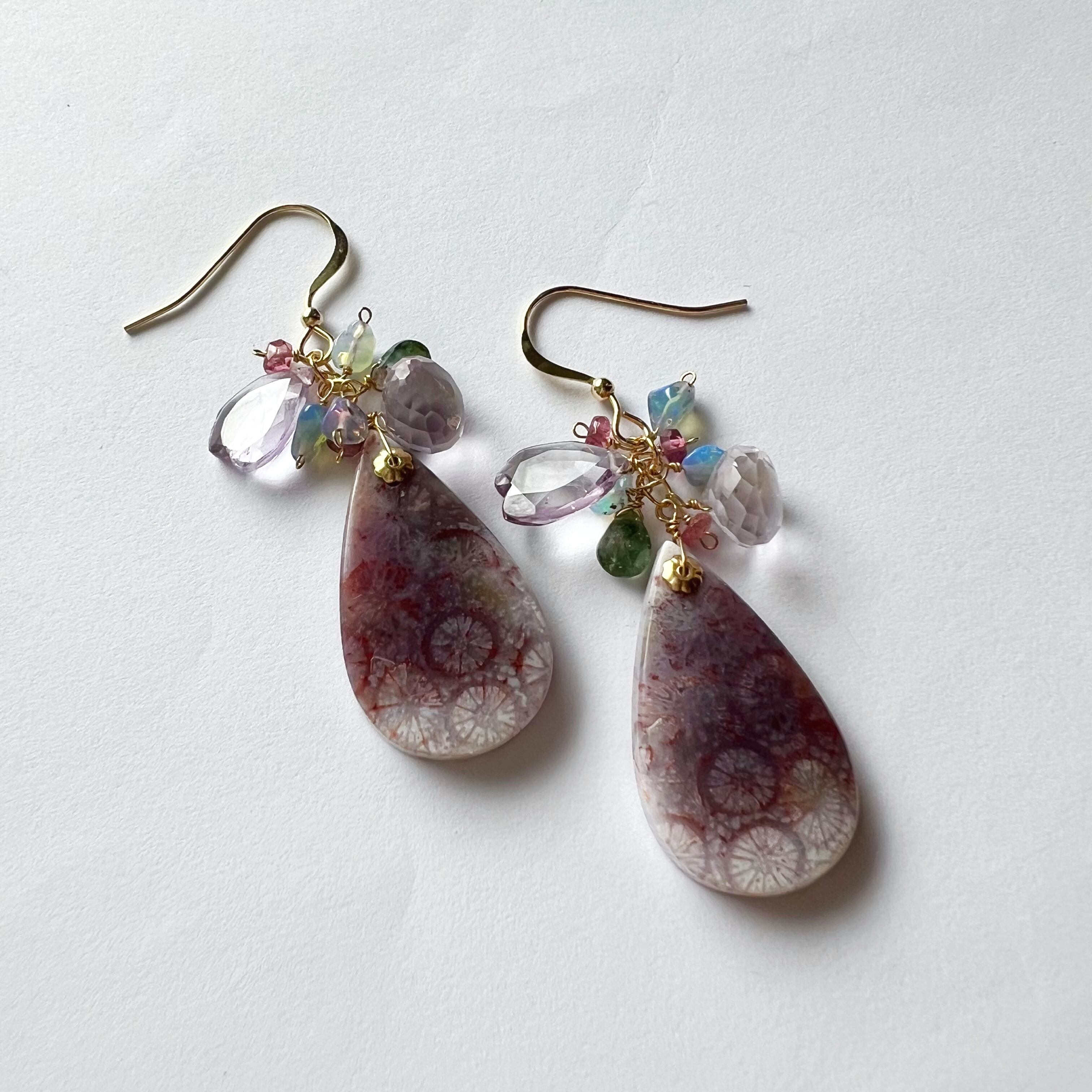 N-218 Moonlit Fossil Coralピアス(フォッシルコーラル、ピンクアメジスト、カラーオパール、トルマリン)