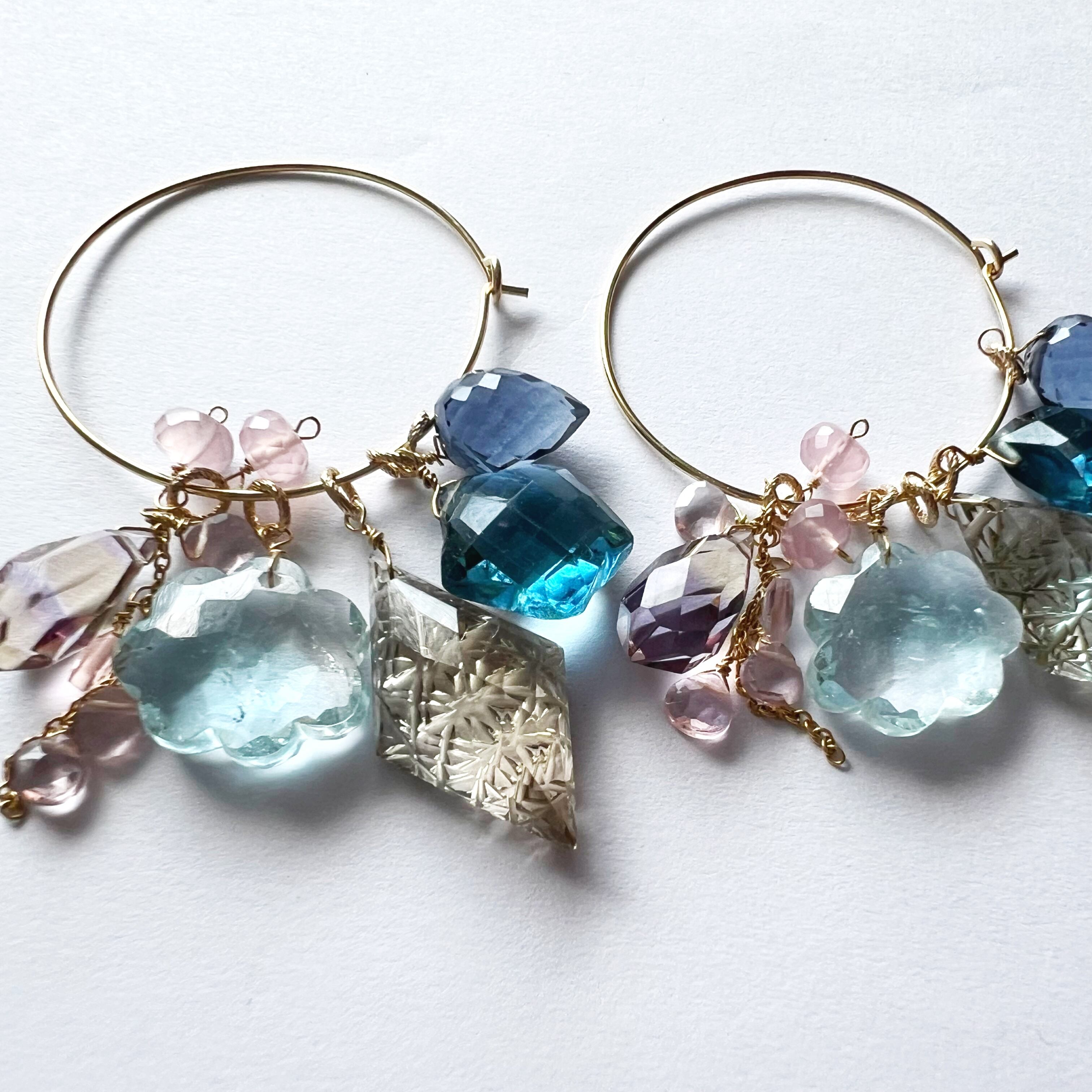 N-180 スモーキークォーツ、ブルートパーズ、ファンシーカラー天然石の着せ替えフープピアス