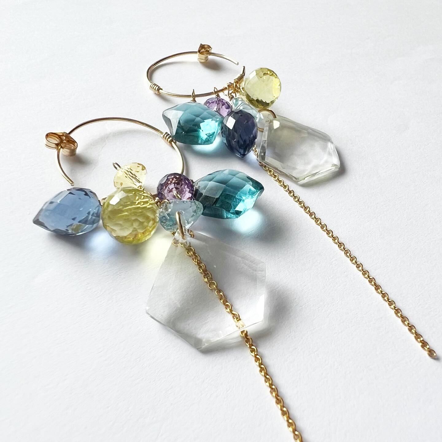 N-183 クリスタルと星形ブルーカラークォーツのロングフープピアス