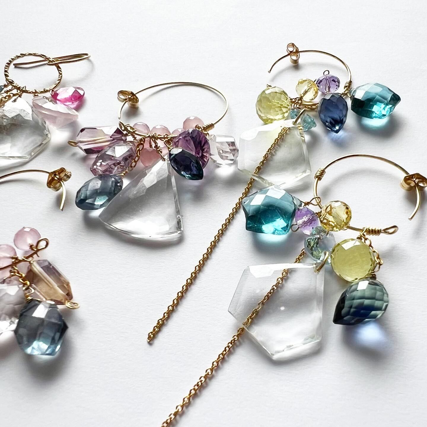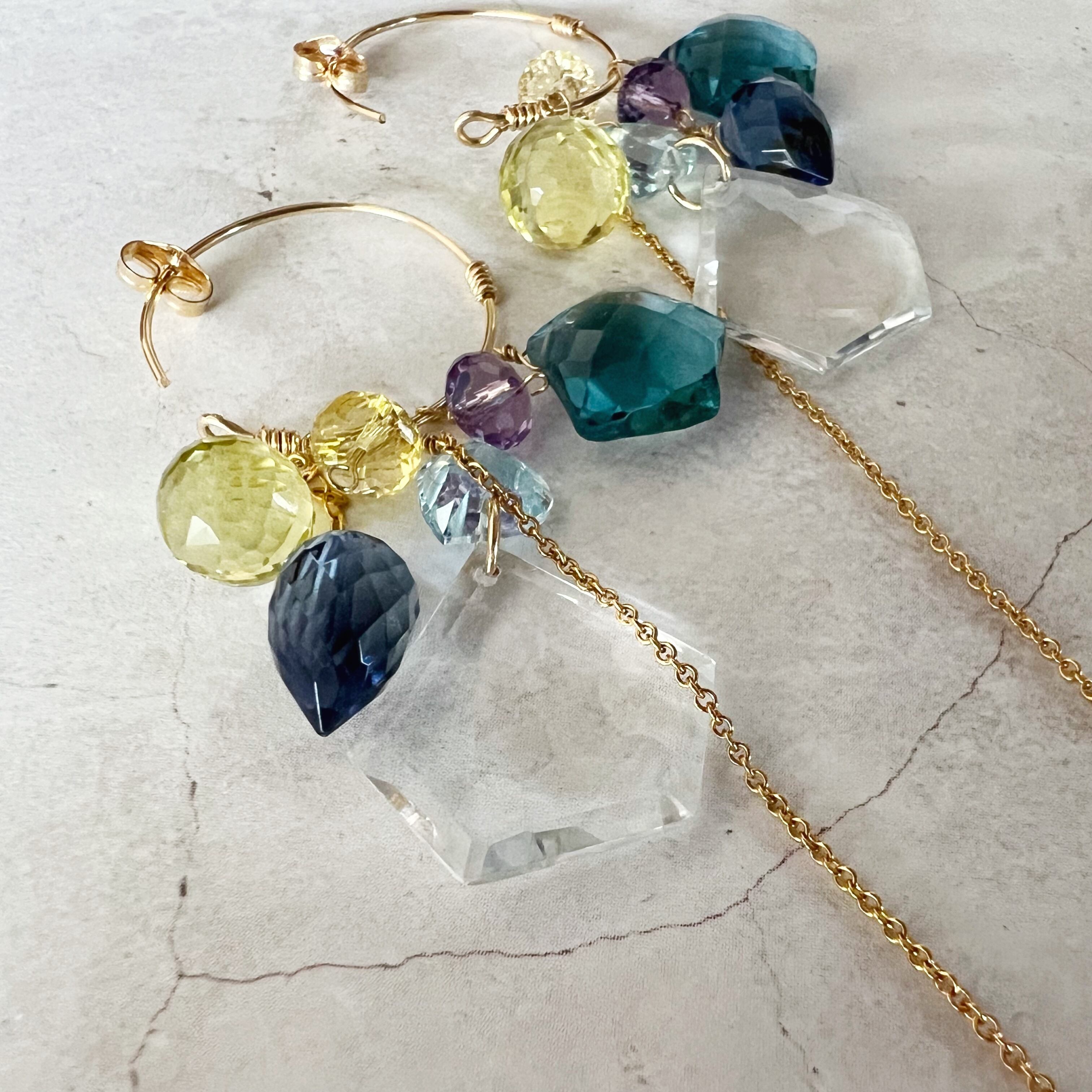 揺れるたびに輝く、クリスタルとブルークォーツのロングフープピアス。エレガントなデザインで、女性らしさを引き立てます。クリスタルと星形のブルークォーツを使用した贅沢なピアスは、まるで星座が宇宙を舞うような幻想的な美しさを感じさせます。